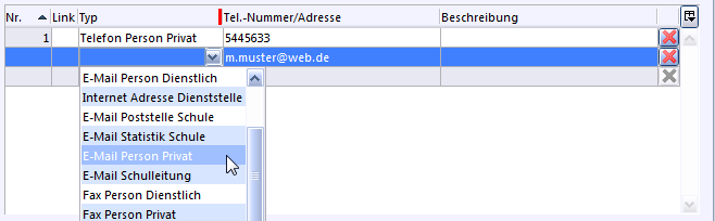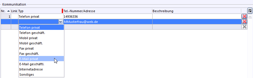 Die Tabelle Kommunikation z. B. beinhaltet zunächst keine Pflichtfelder. Gibt man jedoch eine Nummer oder E-Mail-Adresse in der Spalte Nummer/Adresse ein, muss man auch unter der Spalte Typ eine Auswahl treffen, z. B. Telefon Person Dienstlich oder E-Mail Person Privat, bevor man den Datensatz durch Anklicken der Schaltfläche Speichern oder Zurücksetzen verlassen kann.