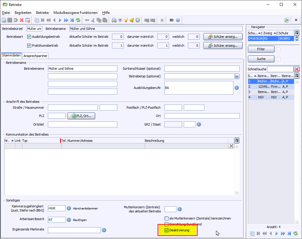 Grundregel: Betriebe können nur gelöscht werden, wenn ihnen im laufenden Schuljahr sowie den vergangenen zwei Schuljahren keine Schüler mehr zugeordnet sind. Hintergund: Ausgetretene Schüler werden erst nach zwei weiteren Schuljahren endgültig in den Datenbereich Ehemalige Schüler verschoben und die Zuordnung zum Betrieb wird gelöst. Bis dahin können Sie Betriebe ggf. deaktivieren, um ein versehentliches Auswählen zu vermeiden.