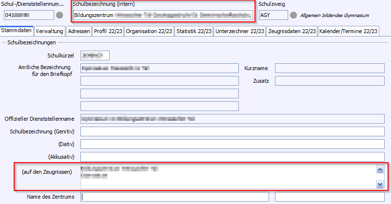 Unter Datei > Schulische Daten > Schulen können Sie im Reiter Stammdaten verschiedene Bezeichnungen Ihrer Schule eintragen, um diese auf Berichten oder Zeugnissen zu verwenden.