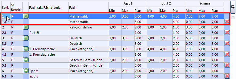 Es wird zwischen Fächern und Fachkategorien unterschieden. Eine Fachkategorie wird verwendet, sobald der Schüler eine Wahlmöglichkeit zwischen mehreren Fächern hat (z. B. 1. Fremdsprache: Wahlmöglichkeit zwischen Englisch und Französisch).