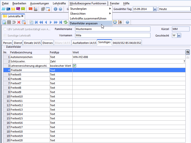Auf dem Reiter Sonstiges können Sie über Modulbezogene Funktionen: Datenfelder anpassen die Feldbezeichnungen von bis zu 20 eigenen Datenfeldern anpassen und die entsprechenden Daten hinterlegen.