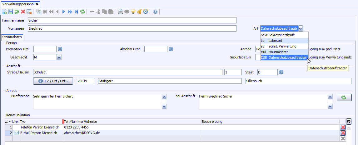 >Wählen Sie Datei: Personal Hier werden vor Allem die in der Verwaltung tätigen Personen angelegt. Weitere Arten von Ansprechpartnern können im Modul Kontakte gepflegt werden. Mit Klick auf das Symbol •Familienname •Vornamen •Art des Personals Auf dem Reiter Stammdaten tragen Sie Angaben zur Person und Anschrift ein oder wählen passende Werte aus den hinterlegten Listen aus.