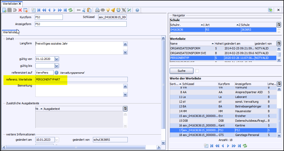 Die Auswahlliste Typ entspricht der in ASV hinterlegten Werteliste Personenzusatz und kann vom Schuladministrator geändert oder erweitert werden. Hinweise, wie Sie dabei vorgehen, finden Sie unter Administrator: Wertelisten der Hoheitsstufe S. |