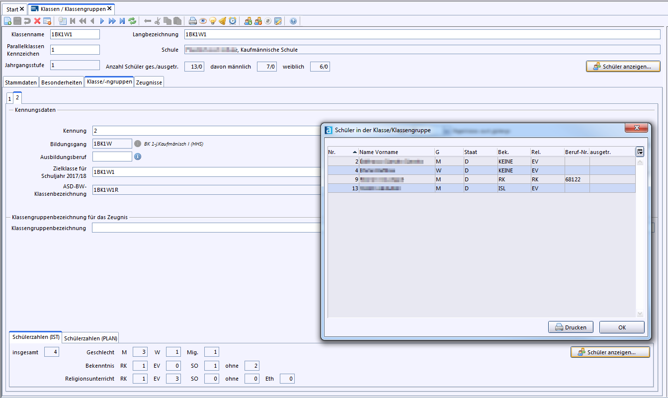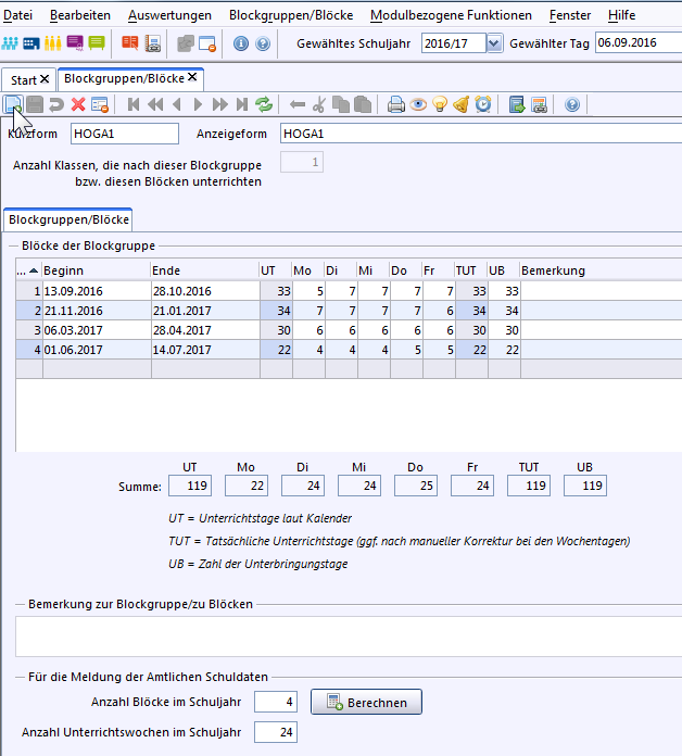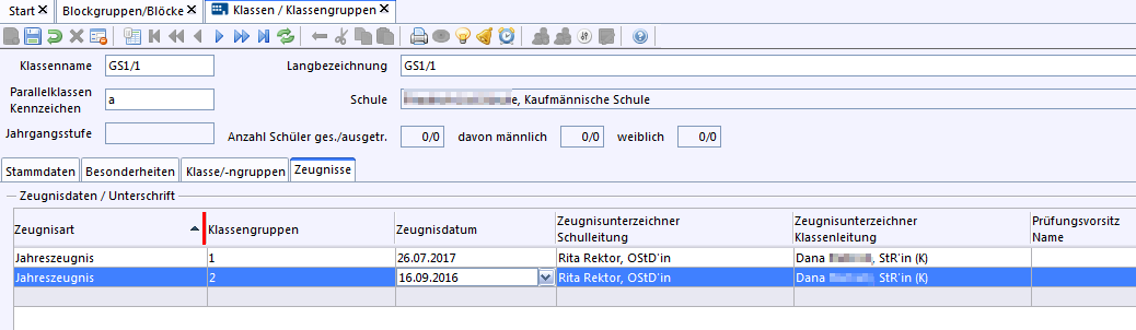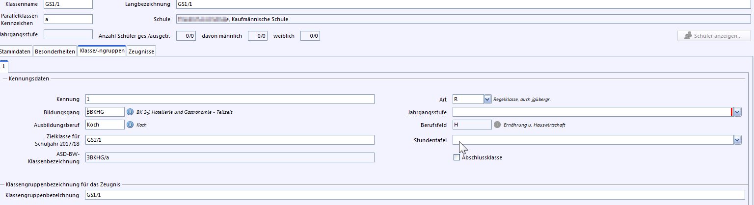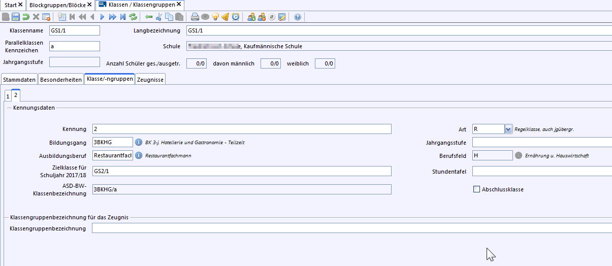 Nach Auswahl der Blockgruppe erscheinen die Daten bei den Stammdaten der Klasse.
