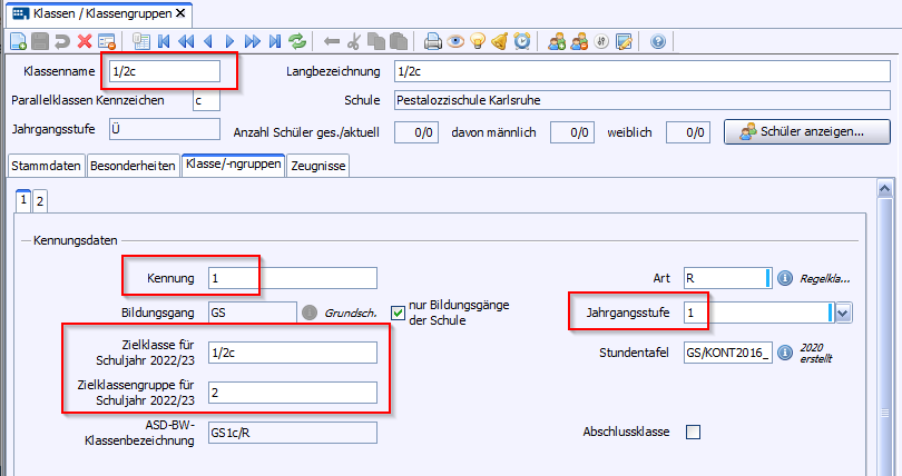 Eine neue Klassengruppe ist angelegt und bis auf die Kennung mit den bisherigen Daten vorbelegt.
