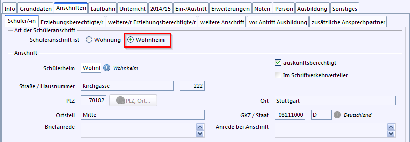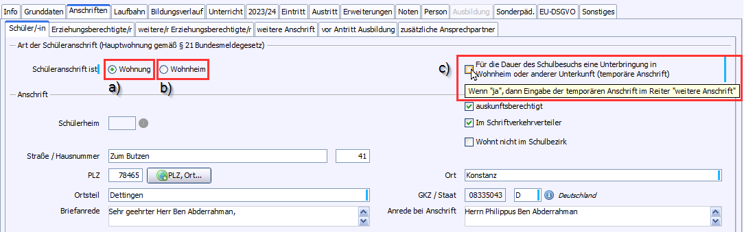 In ASV-BW können mehrere Anschriften zu jedem Schüler erfasst werden: 1.Die Hauptanschrift unter dem Unterreiter Schüler/in. 1.Die Anschriften der Erziehungsberechtigten 2.Eine weitere Anschrifte 3.Die Anschrift vor Antritt Ausbildung.