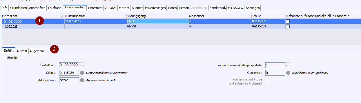 Unter dem Reiter Eintritt wird das Einschulungsdatum vermerkt und es werden die Angaben zu vorherigen Schulbesuchen verwaltet. Der Eintritt in die Schule (bzw. den aktuellen Bildungsgang) wird nicht hier, sondern unter dem Reiter Bildungsverlauf eingetragen.