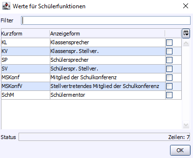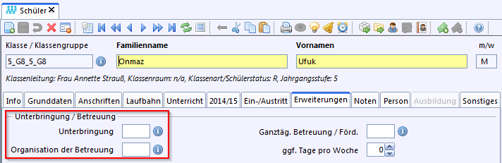 Klassensprecher / Schulsprecher Engagiert sich der Schüler z. B. als Klassensprecher, wird dies unter dem Reiter Erweiterungen im Modul Schüler gepflegt. Die im Feld Schüler hat Funktion als hinterlegte Werteliste kann von der Schule selbst im Modul Wertelisten (Werteliste Schülerfunktion) erweitert und gepflegt werden. Weitere Merkmale Möchten Sie weitere Merkmale oder Aktivitäten einzelner Schüler erfassen (z. B. welches Musikinstrument er in der Schulband spielt), können Sie dies mit Merkern erfassen. Merker müssen zunächst im Modul Wertelisten hinterlegt werden (Werteliste Merker, Hoheit S). Hinweis 1: Es ist leicht mit Filtern (z.B. zz Merker) auf das Feld Merker zuzugreifen und so Schüler zu selektieren. Hinweis 2: Weil es beliebig viele Merker geben könnte, sind sie für die Druckausgabe, z.B. in Listen, nur bedingt geeignet. Hinweis 3: Um zusätzliche Informationen für eine große Anzahl von Schülern zu hinterlegen, sind eher die Datenfelder (unter Sonstiges) geeignet. Folgende Daten zum Schulweg des Schülers können unter dem Reiter Erweiterungen im Modul Schüler erfasst werden: •Fahrgeld •Eigenanteil am Fahrgeld •Länge des Schulwegs •Haltestelle: Den Feldern Haltestelle ist eine Werteliste hinterlegt, die von der Schule selbst im Modul Wertelisten (Werteliste Haltestelle) erweitert und gepflegt werden kann. •Benutztes Verkehrsmittel: Damit Sie in der Spalte Verkehrsmittel einen Wert auswählen können, müssen zuvor im Modul Verkehrsmittel entsprechende Möglichkeiten erfasst worden sein. Nachmittagsbefreiung Ist ein Schüler vom Nachmittagsunterricht befreit, können Sie unter dem Reiter Erweiterungen im Modul Schüler zwei Tage erfassen. Unterbringung / Betreuung Eine zusätzliche Unterbringung bzw. Betreuung (z. B. Hausaufgabenbetreuung) des Schülers werden unter dem Reiter Erweiterungen im Modul Schüler gepflegt. Dazu werden die entsprechenden Felder ausgefüllt. Die Wahl der Betreuungsorganisation erfolgt über eine Werteliste. Die Werteliste Betreuung Organisation (Hoheit S) kann von der Schule selbst im Modul Wertelisten erweitert und gepflegt werden. Ganztägige Betreuung / Förderung (GTS) Die für Ihre Schule festgelegte Form der Ganztagsbetreuung kann hier erfasst werden.