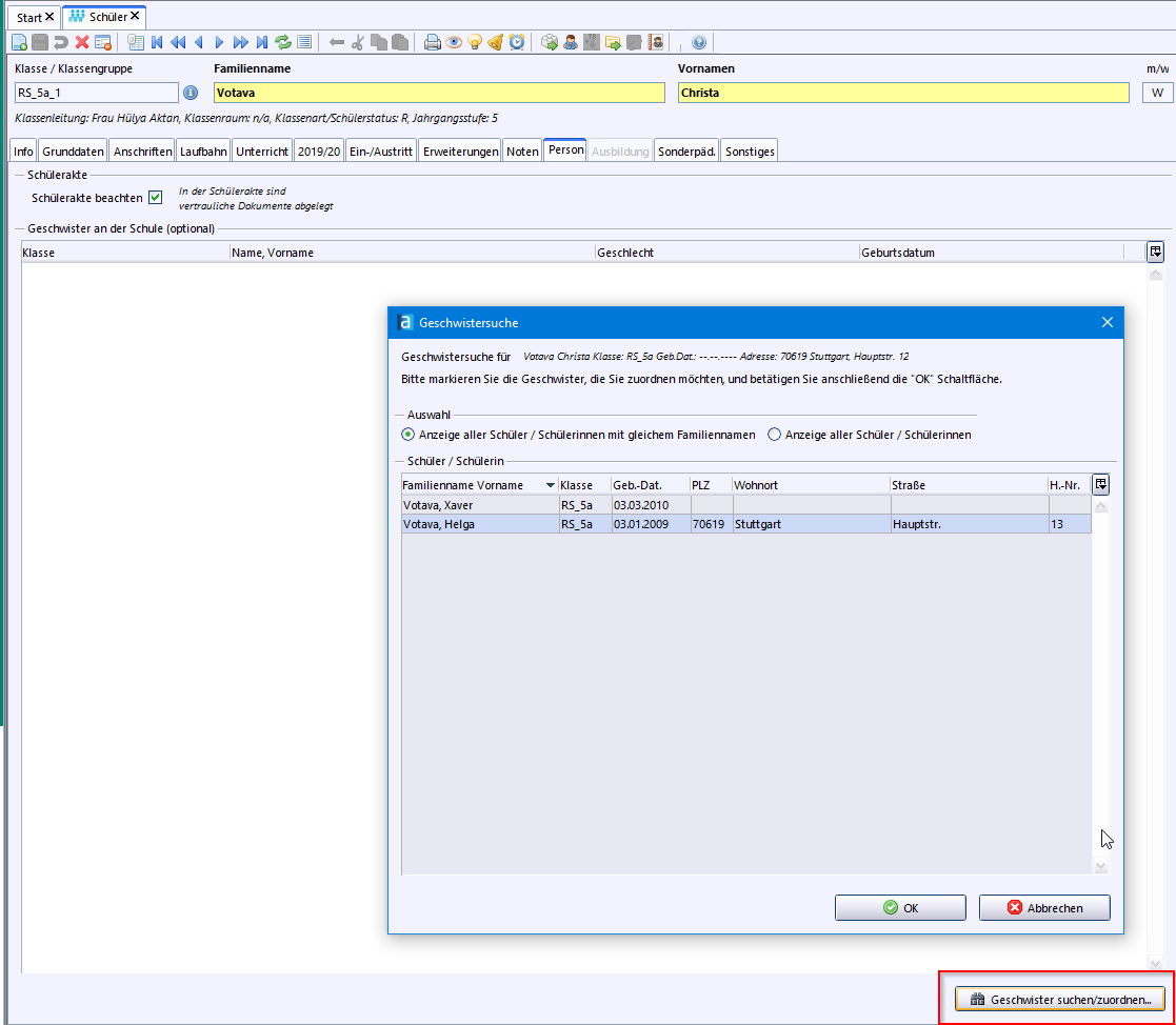 In ASV-BW können Sie Geschwister des Schülers suchen und zuordnen. •Wenn eingetragene Geschwister die Schule verlassen (Austrittsdatum), verbleiben sie dennoch in dieser Zuordnung. Klicken Sie im Modul Schüler unter dem Reiter Person auf die Schaltfläche Geschwister suchen/zuordnen. Es öffnet sich ein Fenster, auf dem Sie folgende Optionen auswählen können: •Anzeige aller Schüler mit gleichem Familiennamen •Anzeige aller Schüler Nachdem Sie das Geschwisterkind ausgewählt und die Schaltfläche OK geklickt haben, werden alle Geschwister in der Tabelle angezeigt. |