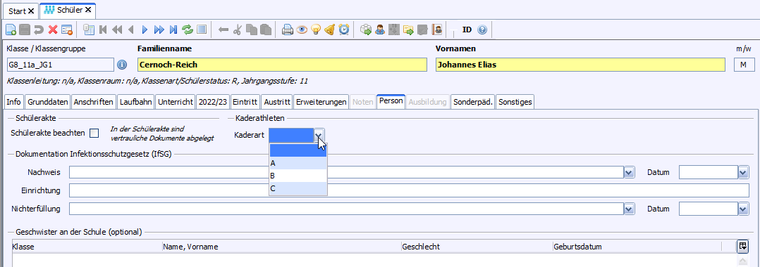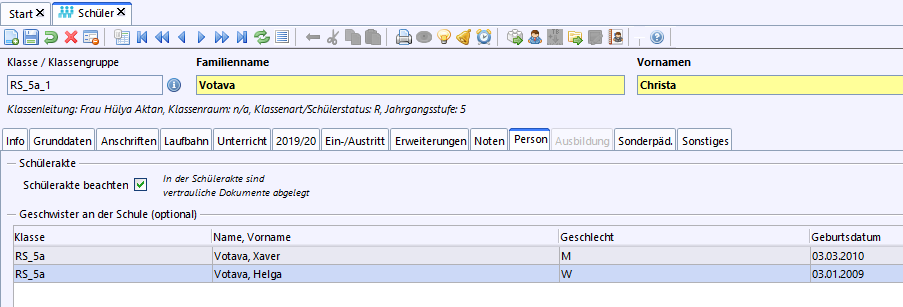 Schülerakte beachten Sie haben die Möglichkeit, unter dem Reiter Person bei Schülerakte beachten einen Haken zu setzen. Das sorgt dafür, dass bei der entsprechenden Person der Hinweis Schülerakte beachten! erscheint. Der Hinweis wird unabhängig des gewählten Unterreiters angezeigt.