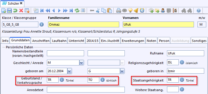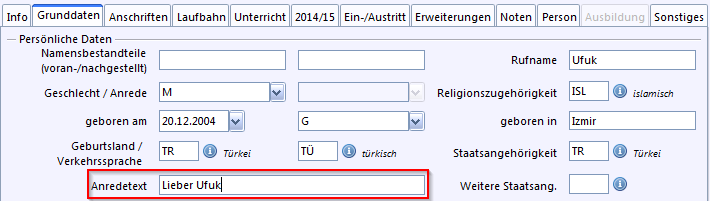 Das Datenfeld Rufname wird bei der Eingabe der Vornamen automatisch mit dem ersten Vornamen gefüllt. Es kann aber angepasst werden. Namensbestandteile Geschlecht Bei Bedarf kann zusätzlich im Feld Geschlecht erweitert zwischen den Werten divers und unbestimmt gewählt werden. Hinweis: Geburtsland, Verkehrssprache Staatsangehörigkeit Anredetext