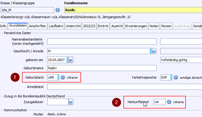 Zuzug aus dem Ausland Als Kooperationsschüler sind hier Stammschüler der Kursstufe eines anderen allgemein bildenden Gymnasiums oder eines anderen beruflichen Gymnasiums gemeint, die an einem Kurs der eigenen Schule teilnehmen. Tragen Sie in diesem Fall im Feld Stammschule/Prüfende Schule bei externen Kooperationsschülern (1) im Modul Schüler unter dem Reiter Grunddaten die fremde Stammschule der Schüler ein. Zusätzlich muss dann noch zwingend eines der beiden Felder Externer Prüfungsteilnehmer besucht derzeit die Schule oder Externer Prüfungsteilnehmer besucht derzeit keine Schule (2) markiert werden. Über die Für UPM müssen die Kooperationsschüler außerdem zwingend in einer Klasse mit der Klassenart KOOP geführt werden. Externer Prüfungsteilnehmer / Schulfremdenprüfung Kooperative Organisationsformen Bitte beachten Sie, dass Schüler in Kooperativen Organisationsformen des gemeinsamen Unterrichts (früher: Außenklassen, statistisch am SBBZ zählend) an der allgemeinen Kooperationsschule ebenfalls gesondert gekennzeichnet werden müssen, damit sie für die ESS korrekt abgebildet werden. Kennzeichnen Sie diese Schüler durch Markieren des Feldes Externer Prüfungsteilnehmer besucht derzeit die Schule. Tragen Sie dort auch die Stammschule (das abgebende SBBZ) ein. Alternativ können die Schüler eines SBBZ auch in einer Klasse mit der Klassenart KOPSCH geführt werden. Beachten Sie dazu die entsprechenden Hinweise im Abschnitt Kooperative Organisationsformen. |