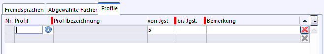 Im unteren Teil können manuell Daten zur Grundschulempfehlung eingetragen werden. Die von einem Schüler in seiner Laufbahn bisher besuchten Fremdsprachen können unter dem Reiter Laufbahn unter dem Unterreiter Fremdsprachen erfasst und gepflegt werden. Bitte beachten Sie, dass dabei kein Unterricht erzeugt wird. Belegt der Schüler im laufenden Schuljahr die Fremdsprache, ist dies bei der Fächerwahl der Schüler unter dem Reiter Fremdsprachen anzuhaken. Der Eintrag dort erzeugt beim Schüler unter dem Reiter Unterricht einen statistisch relevanten Eintrag und wird überdies unter dem Reiter Fremdsprachen beim Schüler mit Fach und Fachbezeichnung hinterlegt. Bitte beachten Sie, dass im Modul nur die Auswahl von Fächern einer Fachkategorie (1. FS, 2. FS) möglich ist, die Sie an das Angebot Ihrer Schule anpassen können. Sobald in der Spalte Fach die Fremdsprache aus der Werteliste ausgewählt wurde, wird in die Spalte Fach die Abkürzung und in die Spalte Fachbezeichnung die Langbezeichnung der Fremdsprache eingetragen. Dieser Eintrag wird über die Fächerwahl automatisch generiert. Wollen Sie eine Fremdsprache eintragen, die nicht in der Werteliste enthalten ist, wählen Sie bitte Sonstige Fremdsprache aus. In den Spalten von bzw. bis Jgst (Jahrgangsstufe) wählen Sie die entsprechenden Werte aus der Werteliste aus. Wurde eine Feststellungsprüfung abgelegt, kann dies in der Spalte Feststellungspr. durch Aktivierung des Kontrollfeldes hinterlegt werden. Möchten Sie dazu einen Freitext, z. B. den Namen der Sonstigen Fremdsprache erfassen, können Sie dies in der Spalte Bemerkung tun. Die Niveaustufe der Fremdsprache wird in der entsprechenden Spalte erfasst. Alternativ können Sie diese Felder per Sammeländerung für Schülergruppen oder ganze Klassen durchführen. Abgewählte Fächer siehe Kapitel Vorgänge - Abgewählte Fächer. Das am Gymnasium belegte Profil wird im Modul Schüler unter dem Unterreiter Laufbahn hinterlegt. Folgende Werteliste ist z. B. bei einem allgemeinbildenden Gymnasium hinterlegt: |