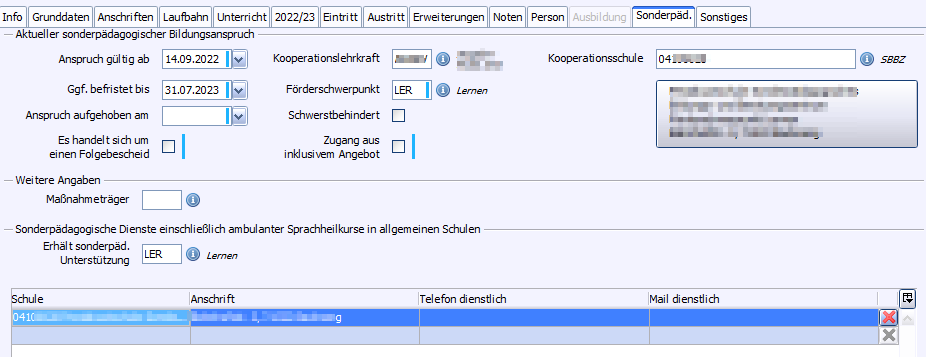 Über den Reiter Sonderpäd. erfassen Sie Daten zum Sonderpädagogischen Bildungsanspruch. Die meisten Felder öffnen sich erst sobald ein Termin des Feststellungsbescheides eingetragen ist. Fehlen im aktuellen Schuljahr die Einträge bei den Schülern, so können diese über ein Schnittstellenskript aus dem vorhergehendem Schuljahr kopiert werden Der Haken im Feld Zugang aus inklusivem Angebot wird gesetzt, wenn der Schüler einen Feststellungsbescheid hat und in der alten Schule auch schon inklusiv beschult wurde. Sie können bei Bedarf Ansprechpartner (z. B. von Teams) aufführen. Über die Funktion Tabelle exportieren können Sie z. B. alle Teilnehmer per Mail einladen. Siehe auch: Kontakte anlegen und Emailadressen nach Outlook exportieren. |
