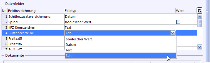 So gehen Sie vor: Ihnen stehen die Feldtypen boolescher Wert, Datum, Text und Zahl zur Verfügung. Sind in einem Datenfeld bereits Eingaben vorhanden, kann der Feldtyp nicht mehr geändert werden.