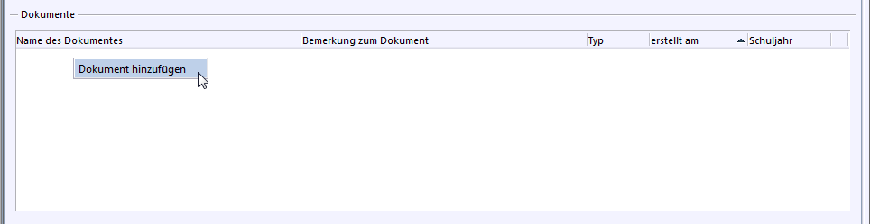 Nachdem Sie ein Dokument hinzugefügt haben, werden in der Tabelle in den entsprechenden Spalten folgende Werte angezeigt: •Erstellt am: Datum des Tages, an dem das Dokument hinzugefügt wurde •Schuljahr: Schuljahr, an dem das Dokument hinzugefügt wurde