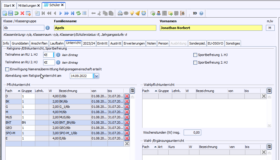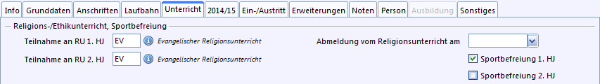 Der vom Schüler besuchte Unterricht, wird unter dem Reiter Unterricht im Modul Schüler abgebildet und kann teilweise dort gepflegt werden. Folgende Unterrichtsmerkmale können auf diesem Reiter gepflegt werden: •Teilnahme am Religionsunterricht im 1. bzw. 2. Halbjahr •Abmeldung vom Religionsunterricht •Sportbefreiung im 1. bzw. 2. Halbjahr •in welcher Gruppe eines Pflichtfachs der Schüler unterrichtet wird (z. B. Datenverarbeitung Gruppe 1 am Dienstag oder Gruppe 2 am Freitag) •zu welcher Art ein Wahl-/Ergänzungsfach gehört (z. B. Arbeitsgemeinschaft etc.) •Realschule Klasse 7-9: Hier kann die Niveaustufe (G oder M) des Schülers jeweils für das 1. und 2. Halbjahr eingetragen werden. •Realschule: Hier kann die Teilnahme am Mentorenprogramm vermerkt werden •GMS: Hier kann der Elternwunsch eingetragen werden, ob Noten auf dem Lernentwicklungsbericht ausgewiesen werden oder nicht. Alle anderen Felder sind reine Anzeigefelder, die auf diesem Reiter nicht verändert werden können. Die Fächer (Pflicht-, Wahlpflicht-, Wahl- bzw. Ergänzungsfächer), die ein Schüler belegt, werden im Modul Fächerwahl der Schüler dem Schüler zugewiesen. Unter jeder Tabelle werden in dem Feld Wochenstunden (W) insgesamt die Stunden des jeweiligen Unterrichts an der im Navigator ausgewählten Schule angezeigt. Dabei ist zu beachten, dass Unterricht, der an einer anderen Schule erteilt wird, mit 0 Wochenstunden gezählt wird. In folgenden Spalte werden die im Modul Unterricht hinterlegten Daten angezeigt: •Lehrkraft in der Tabelle Pflicht- und Wahlpflichtunterricht •Bezeichnung in der Tabelle Pflicht-, Wahlpflicht-, Wahl- und Ergänzungsunterricht •W (Wochenstunden) in der Tabelle Pflicht-, Wahlpflicht-, Wahl- und Ergänzungsunterricht •Kurs in der Tabelle Wahl- und Ergänzungsunterricht In den Bereichen Unterrichtselement und Besuchtes Fach werden ebenfalls die im Modul Unterricht hinterlegten Daten angezeigt. Teilnahme / Nichtteilnahme am Religionsunterricht Dabei ist zu beachten, dass die beiden Felder Teilnahme am RU 1. Hj bzw. 2. HJ anhand der Konfession des Schülers, die unter dem Reiter Grunddaten erfasst wurde, vorbelegt werden. •Meldet sich der Schüler vom Religionsunterricht ab, so wird das Abmeldedatum im Feld Abmeldung vom Religionsunterricht am eingetragen. •Dieses Feld kann nur befüllt werden, wenn beim Schüler eine Konfession eingetragen ist. •Bitte beachten Sie, dass der eingetragene Abmeldetermin spätestens zwei Wochen nach jeweiligem Unterrichtsbeginn liegen muss. Sportbefreiung Zuweisung des Schülers zu einer Fachgruppe (Pflichtfachgruppe) Die Zuweisung erfolgt unter dem Reiter Unterricht im Modul Schüler in der Spalte Gruppe der Tabelle Pflichtunterricht. Nach Auswahl der entsprechenden Gruppe werden in den restlichen Spalten der Tabelle die im Modul Unterricht hinterlegten Daten angezeigt. Zuweisung der Art eines Wahl- bzw. Ergänzungsfachs Unterricht des Schülers, der an anderen Schulen stattfindet Dazu muss zunächst das Fach des Schülers ausgewählt werden, das an einer anderen Schule unterrichtet wird. Nach einem Klick auf die Schaltfläche anderer Schule zuordnen wird die entsprechende Schule aus der Werteliste ausgewählt. Nachdem die Schaltfläche OK angeklickt wurde, ändert sich: •die Anzeige der Wochenstunden in der Spalte W auf 0 Stunden •die Daten, die in den anderen Spalten angezeigt wurden, werden nicht mehr angezeigt Wird der Unterricht später an der eigenen Schule angeboten, wird der Vorgang durch einen Klick auf die Schaltfläche von anderer Schule zurückholen rückgängig gemacht. |
