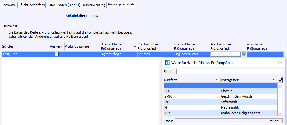 Tipp: Belegen Sie je nach Schülerwahl gleich zu Beginn der Jahrgangsstufe 1 das Fach als 2. Prüfungsfach und führen Sie erst anschließend über Modulbezogene Funktionen die Vorbelegung der Fachwahl aus.