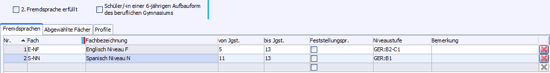 Datei: Schülerdaten > Schüler / Reiter: Laufbahn Haben Schülerinnen oder Schüler bereits vor Eintritt in die Jahrgangsstufe 1 eine zweite Fremdsprache im erforderlichen Umfang (§37, Abs. 2 BGVO) besucht, ist sie auf diesem Reiter aufzuführen, damit die Fremdsprachenreihenfolge auf dem Abiturzeugnis stimmt. Achtung: Die GER-Niveaus werden ab dem Abiturjahr 2024 nicht mehr automatisch auf dem Zeugnis der Allgemeinen Hochschulreife ausgegeben, sondern im Jahreszeugnis der Eingangsklasse und den Kurszeugnissen 1.2 und 2.2 sofern erreicht. Andernfalls steht kein Niveau im jeweiligen Zeugnis, d.h. auch kein geringeres. Im Jahreszeugnis wird es ausgewiesen, sofern mind. die Endnote ausreichend, im zweiten und vierten Kurszeugnis sofern mind. glatte 5 NP im Schnitt der beiden Halbjahre erreicht wurde. Für den GER-Niveauausweis der besuchten Fremdsprachen im Abiturzeugnis sind die Fachnamen der BGVO z.B. F-NF oder S-NN und die erreichten Niveaus zu erfassen, eine Plausibilisierung hinsichtlich des Niveaueintrags erfolgt nicht.