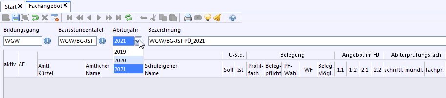 Das Modul Fachangebot ist im Ursprungszustand leer und ist für die im Navigator angezeigten Abiturjahre über Klick auf Neuen Datensatz hinzufügen zu ergänzen. Das dritte Abiturjahr rechts außen im Navigator dient hier lediglich zu Planungszwecken.