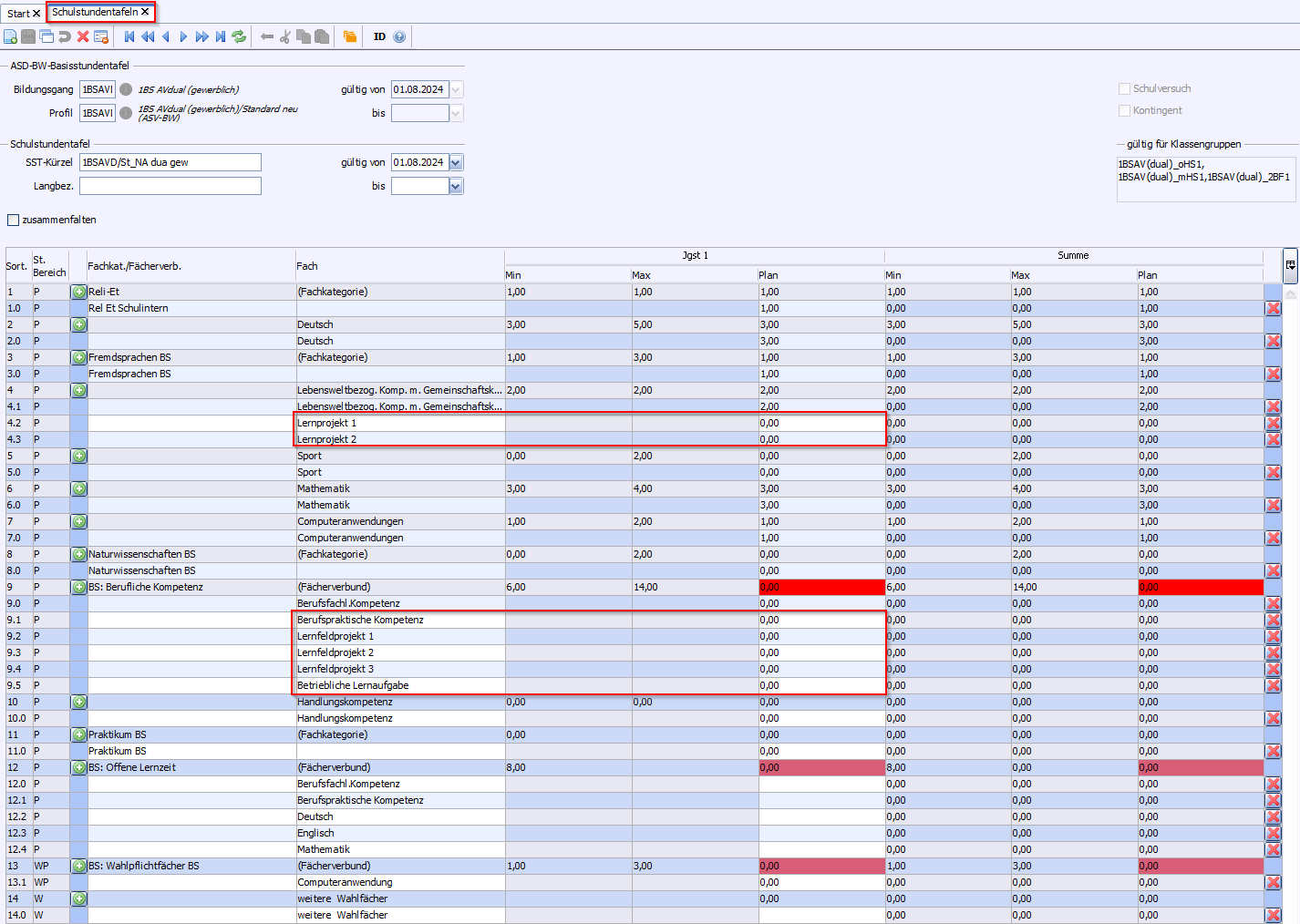 Die neu angelegten Fächer müssen noch in die Schulstundentafel eingefügt werden und es müssen Stunden zugeordnet werden, damit sie in der Fächerwahl zur Verfügung stehen. Es genügt, den Fächern "0" Stunden zuzuordnen.