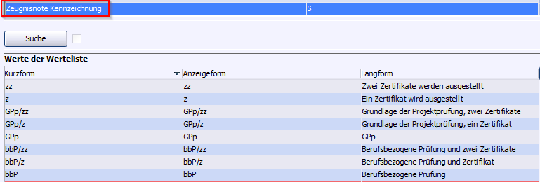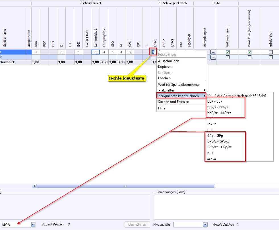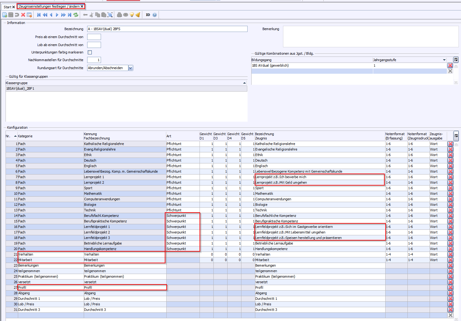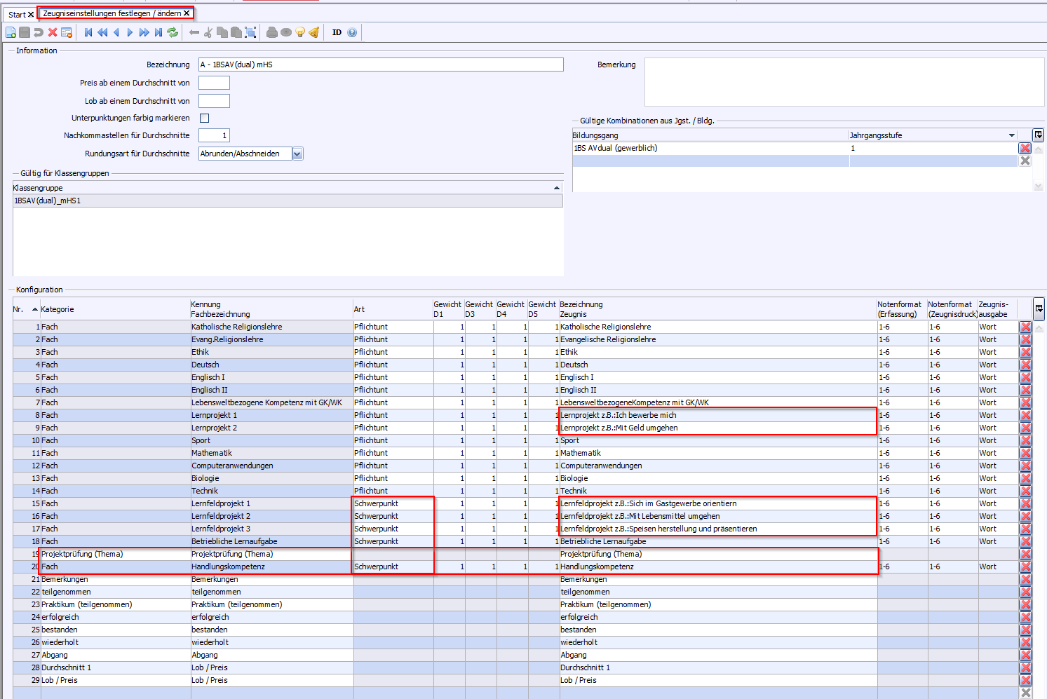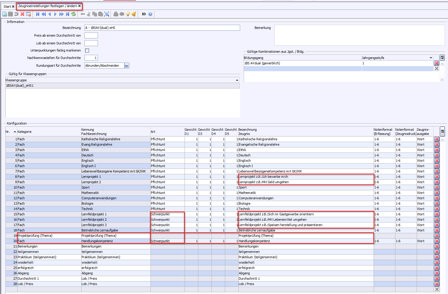 >Die Fächer (z. B. Lernfeldprojekte (LFP)), die auf der rechten Seite unterhalb der Beruflichen Kompetenz ausgegeben werden sollen, sind in der Spalt Art als Schwerpunkt zu kennzeichnen. In der Spalte Bezeichnung Zeugnis ist der Titel des Lernfeldprojekts (z. B. Gäste bewirten) einzutragen.