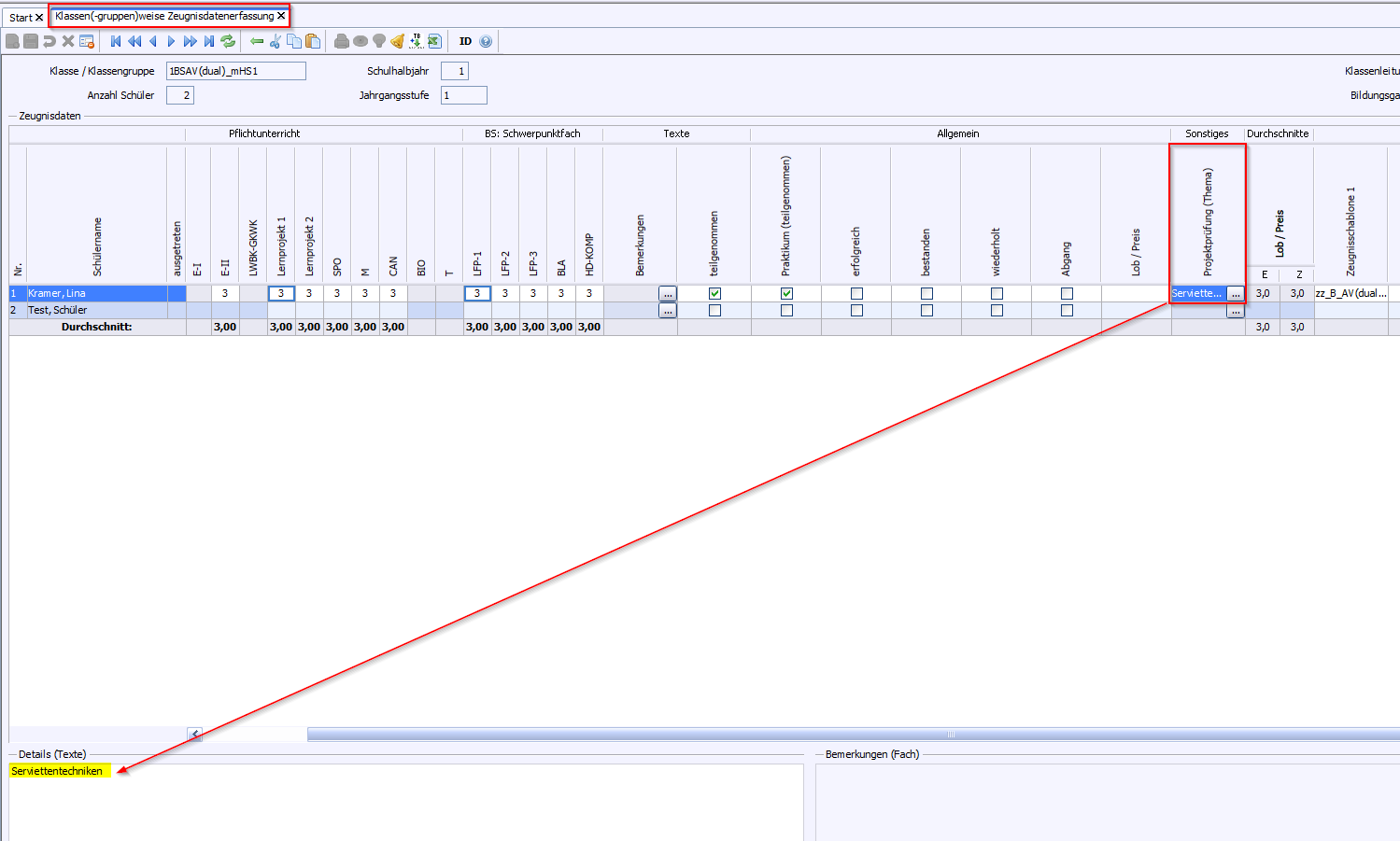 >Als Zusatzkategorien sind Projektprüfung (Thema), Bemerkungen, teilgenommen, Praktikum (teilgenommen), erfolgreich, bestanden, wiederholt, Abgang einzutragen, sowie evtl. Durchschnitt 1 und Lob / Preis.