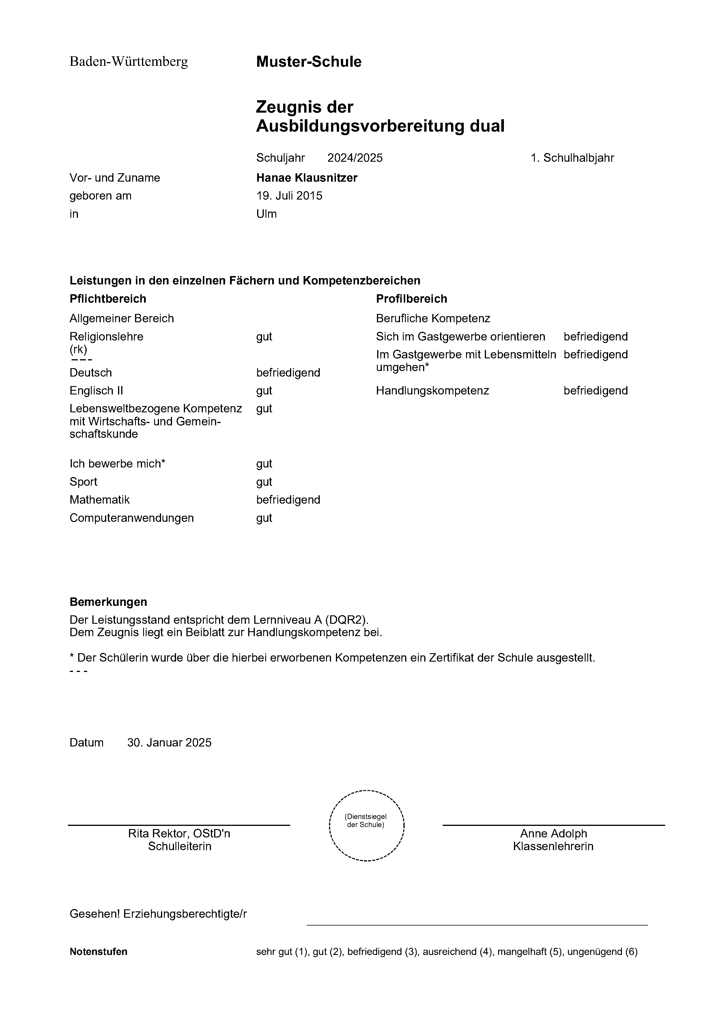 >In AV und AV Dual gibt es für Schüler, die im Niveau 2BF unterrichtet werden, kein Halbjahreszeugnis, sondern eine Halbjahresinformation.