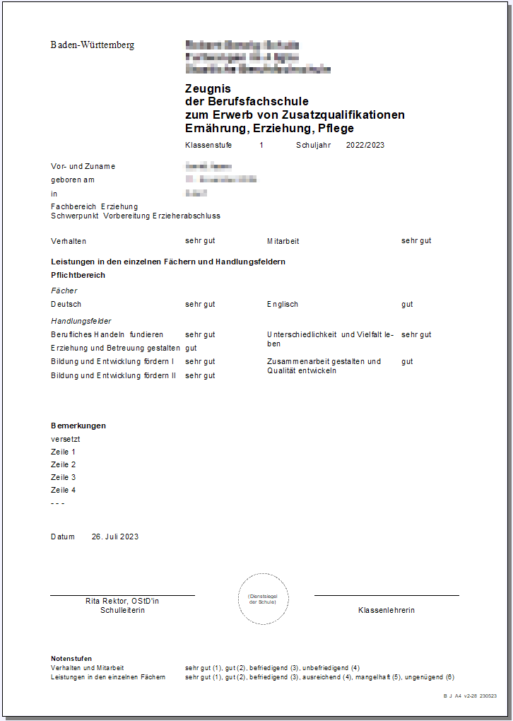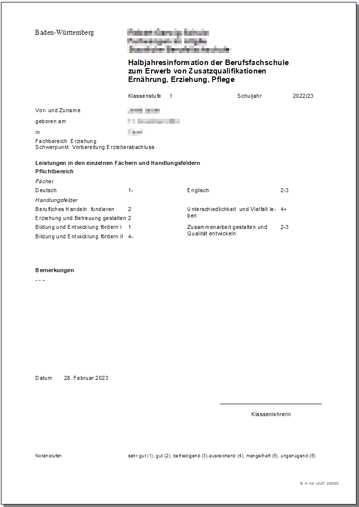 Zeugnis / Abgangszeugnis (1. Schuljahr) |