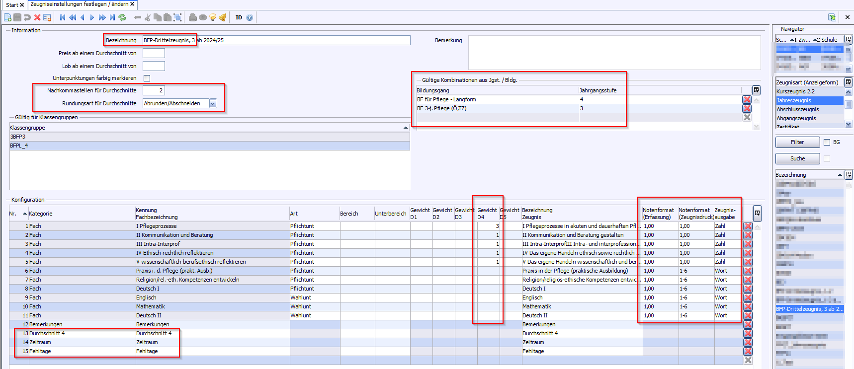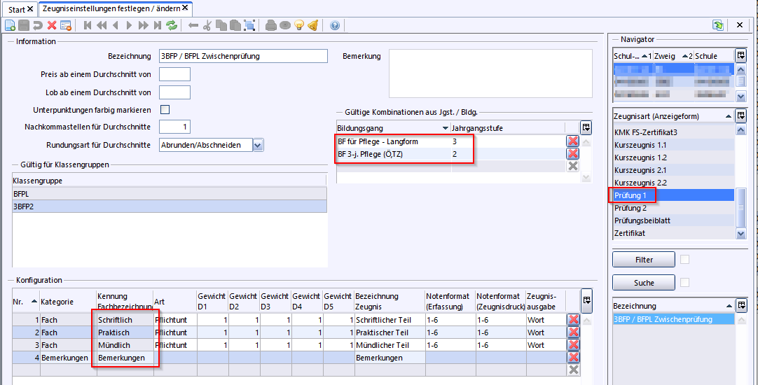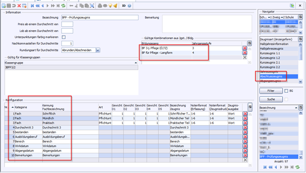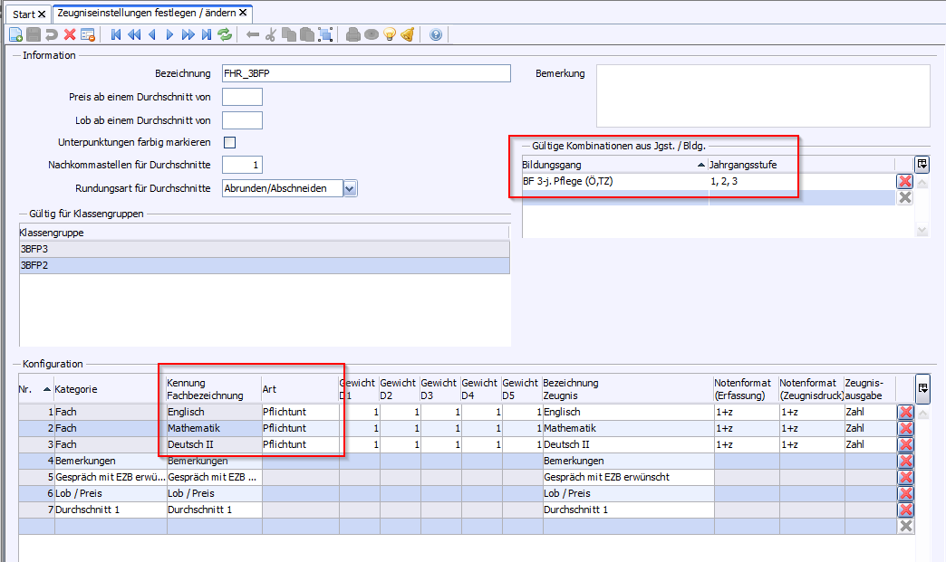 Navigation: Zeugnisse > Zeugniskonfiguration > Berufliche Schulen > BFS - Berufsfachschule 3BFP/BFPL |