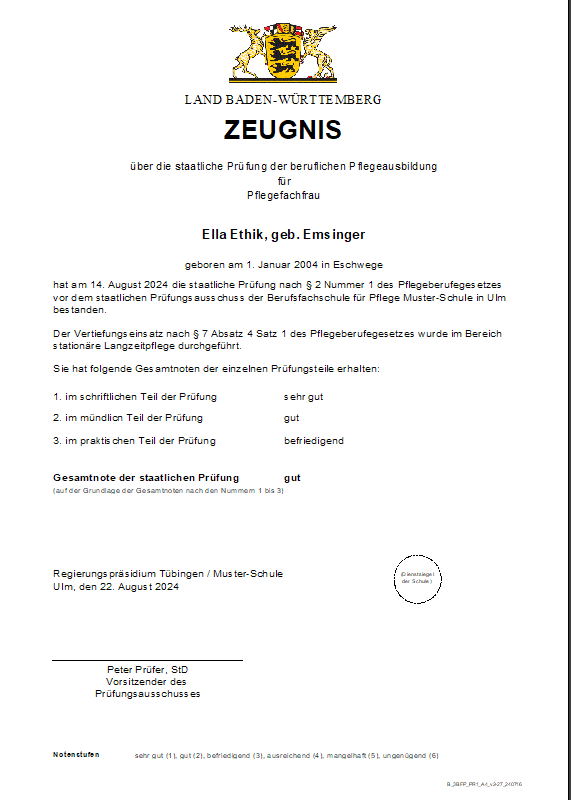 >Wählen Sie für das Zeugnis der Staatlichen Prüfung zz_B_BFP_A_A4_A_PR1. >Tragen Sie die Noten der schriftlichen, mündlichen und praktischen Prüfung ein. Die Gesamtnote wird anhand von Durchschnitt 3 errechnet. >Ausbildungsberuf: Standardmäßig wird als Ausbildungsberuf Pflegefachfrau / Pflegefachmann ausgegeben. Andere Ausbildungsberufe können über diese Kategorie erfasst werden: