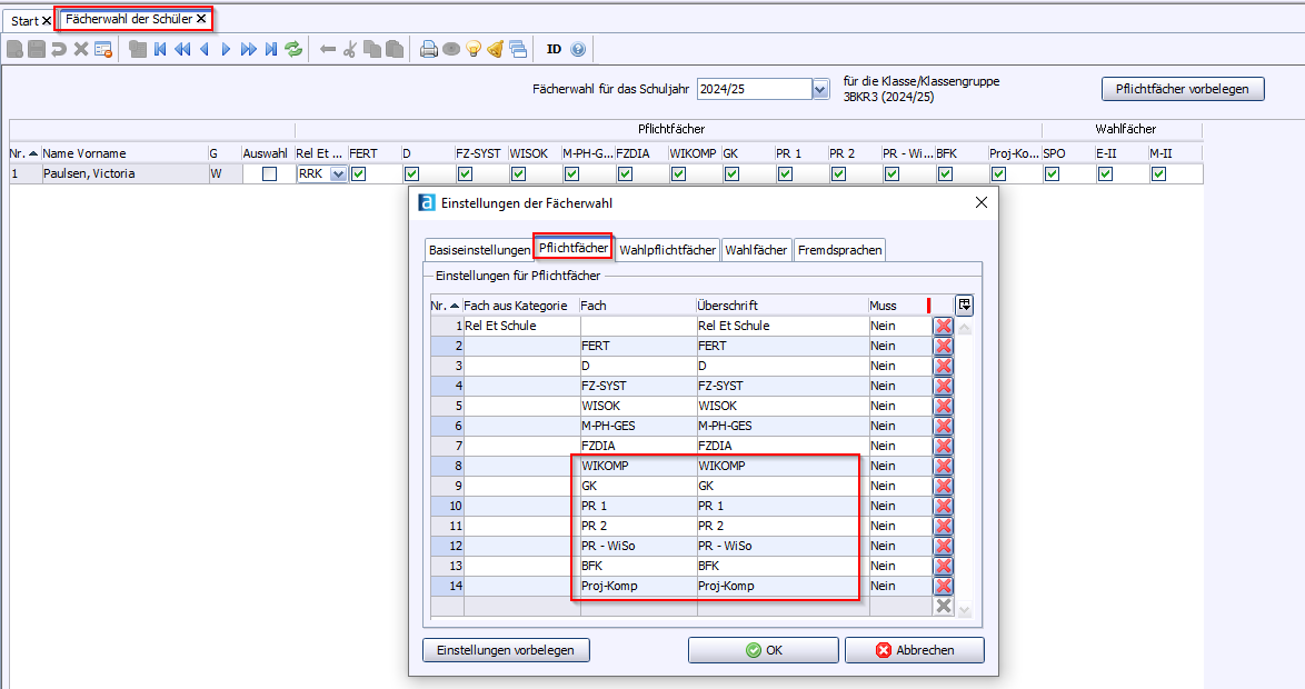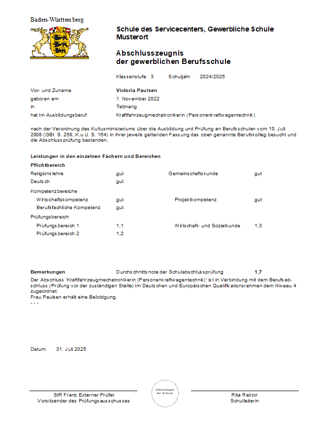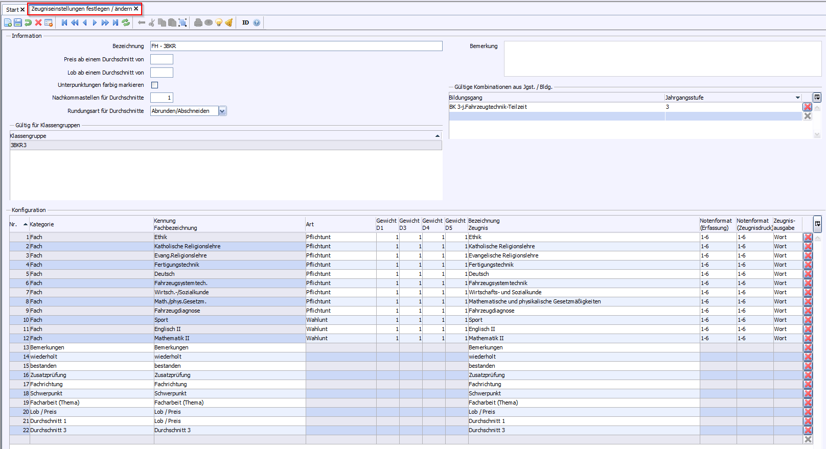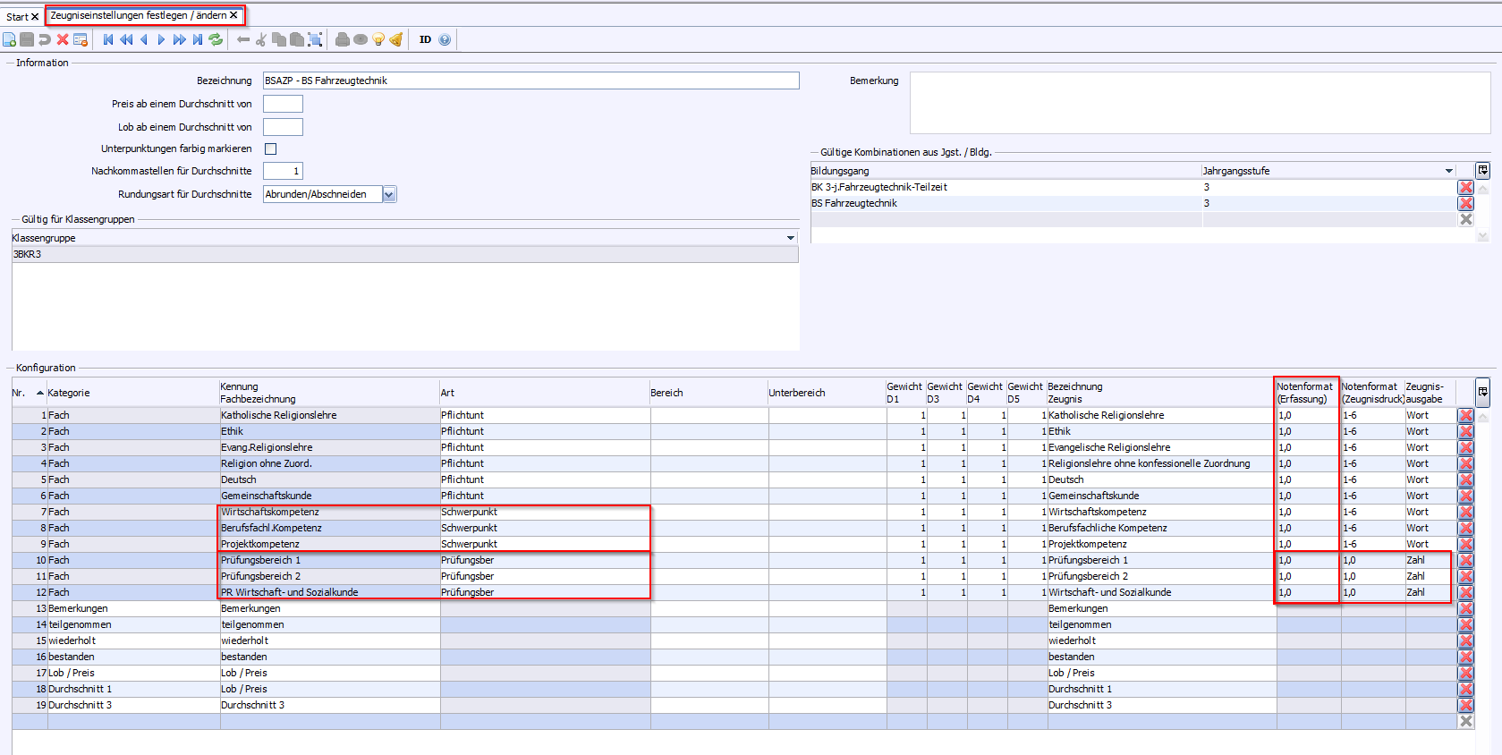 p Die unterschiedlichen Texte auf den Zeugnissen werden gemäß der in den Klassen zugewiesenen Stundentafeln erstellt. Siehe Voraussetzungen. Für die Erfassung von Einzelnoten bei zwei Abschlüssen (Assistent und Fachhochschulreife) können Sie die von uns bereitgestellten Notenblöcke verwenden. (Einstellungen Notenverwaltung) |