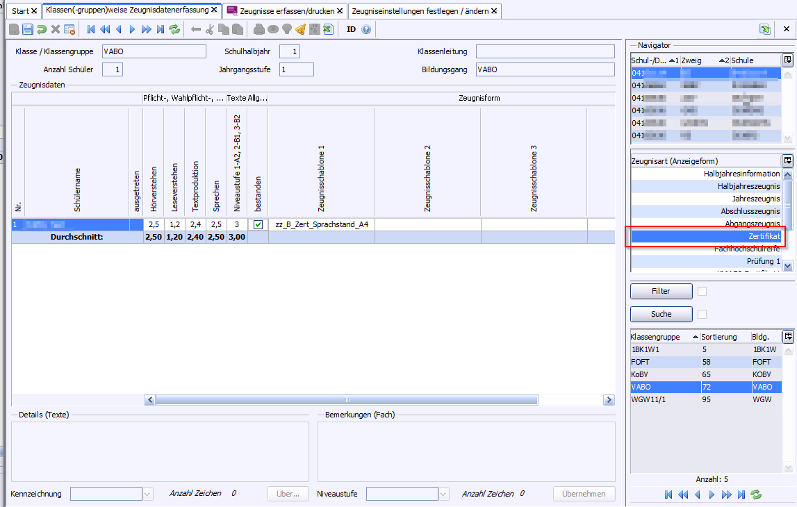 >Fügen Sie folgende Zusatzleistungen in die Zeugniskonfiguration ein: bestanden, Niveaustufe
