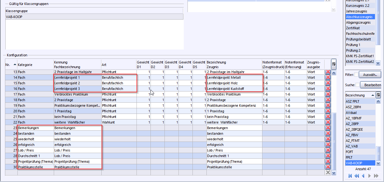 >Fügen Sie folgende Zusatzleistungen in die Zeugniskonfiguration ein: Bemerkungen, bestanden,wiederholt,erfolgreich,Lob / Preis, Durchschnitt 1,Projektprüfung (Thema), Praktikumsstelle