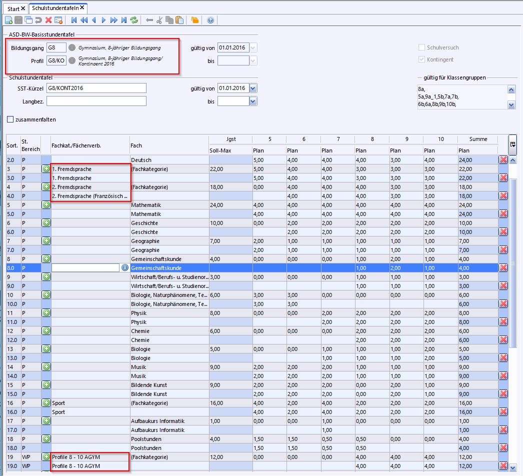 Im Bereich Laufbahn muss festgelegt werden, welches für den jeweiligen Schüler die 1., 2. und ggf. 3. Fremdsprache ist, sowie das vom Schüler gewählte Profil.