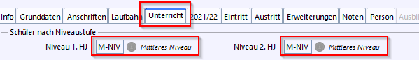 Die Zeugnisse der Realschule weisen aus, auf welcher Niveaustufe ein Schüler unterrichtet wurde. Dazu muss im Modul Schüler im Reiter Unterricht die Niveaustufe gewählt werden.