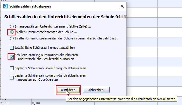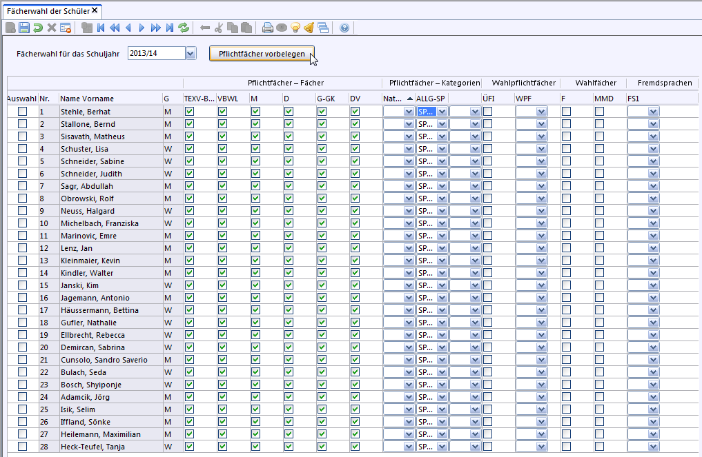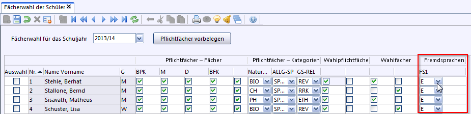 Fächerwahl) können auf Grundlage der Stundentafel, die im Modul Klassen auf dem Reiter Klassengruppe hinterlegt ist, den Schülern die Fächer zugewiesen werden, die sie belegen werden.