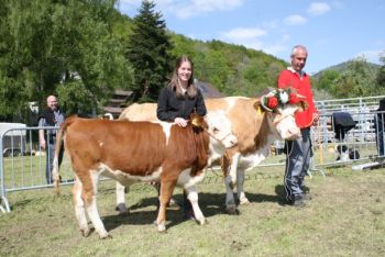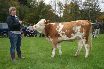 Arinax P bringt zur Hälfte genetisch hornloses, quelliges Vieh. Hier zu sehen beim weiblichen Absetzer, dem elften Kalb der ältesten Mutterkuh der Hinterwälderschau, der Benbärtochter Flora. Der Fleischansatz des Kalbes wurde mit 7,5 bewertet werden. Hubert Thoma aus Todtnau- Aftersteg ist der Züchter, Tochter Kathrin half kräftig mit.