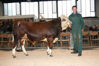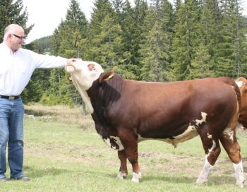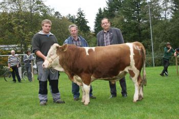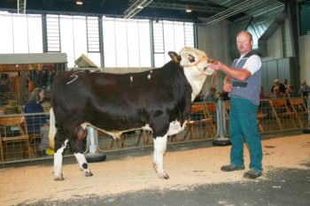 Zweitplatziert war der einheitlichste Bulle Giraldo, ein weiterer Gipadasohn mit 130 cm im Widerrist, der mit je 7 in Bemuskelung und Äußerer Erscheinung eintaxiert war. Stefan Weiss aus Schönwald (rechts) bot den stationsgeprüften Bullen an, Züchterkollege Otmar Klausmann aus St. Georgen- Oberkirnach ersteigerte ihn für 1.500 € netto.