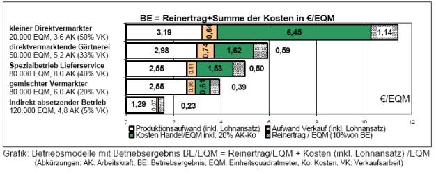 Der Biogemüseanbau in Baden-Württemberg ist kleinstrukturiert, 70% der Betriebe haben einen geschützten Anbau mit durchschnittlich 2.300m². Kennzeichnend ist weiterhin die hohe Leistungsfähigkeit in der Direktvermarktung. Schwerpunktregionen sind Südbaden, der Bodensee- und der Stuttgarter Raum. Die Vielfalt der Betriebe zeigt sich unter anderem daran, dass im Mittel drei verschiedene Vermarktungswege von einem Betrieb bedient werden. Im Gesamtdurchschnitt verteilt sich der Umsatz aus Sicht der befragten Produktionsbetriebe auf folgende Vermarktungswege: 19% Hofladen, 30% Wochenmarkt, 12% Lieferservice, 20% Naturkostgroßhandel bzw. Erzeugergemeinschaft, 15% Wiederverkäufer (Einzelhandel / Kollegen / Großmarkt). Im Durchschnitt ist die Freilandfläche der Ökobetriebe 5,2 ha groß. Der gemittelte Bedarf an Arbeitskräften pro Fläche ist aufgrund des breiten Anbauprogramms und der zeitintensiven Direktvermarktung im Biogemüseanbau mit 0,8 AK/10.000 EQM (inkl. 0,3 AK für die Vermarktung) größer als im konventionellen Anbau. Die erwirtschaftete Leistung pro Flächeneinheit ist im Ökoanbau niedriger, da der 20%-ige Gründüngungsanteil betriebswirtschaftlich nur Kosten verursacht und nicht zum Erfolg beiträgt. Der höhere Preis für Biogemüse (Durchschnittswert nach ZMP: + 63,5%) muss das geringere Ertragsniveau (Mittelwert bei Freilandkulturen: -30%) und die zusätzlichen Kosten des Bioanbaus ausgleichen. In Bilanzanalysen zeigt sich ein geringeres Lohnniveau im Vergleich zu konventionellen Kollegen. Der Kostenblock Arbeit beansprucht im Ökoanbau 50% der Gesamtkosten und geht auf arbeitsintensivere Verfahren bei der Unkrautbekämpfung, Ernte und Marktaufbereitung zurück. Die folgende Grafik zeigt Kostenstruktur, Reinertrag und Betriebsergebnis verschiedener Modelltypen.