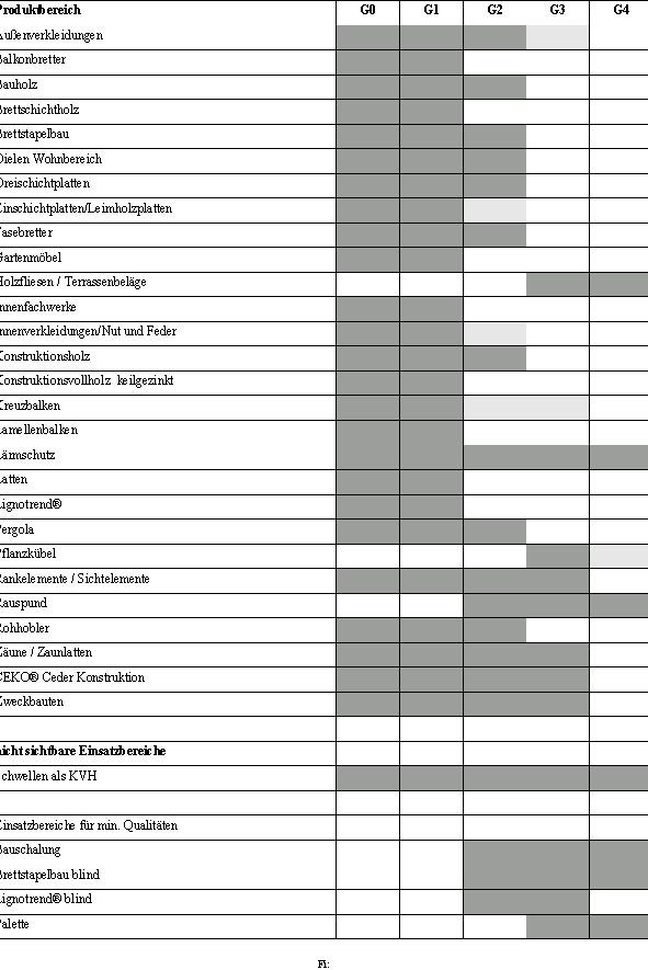 - Vorwiegend optisch orientierte Verwendungen (Rohfriesen, Landhausdielen, Leimholzplatten, Fas-sadenschalung, Garten- und sonstiger Außenbereich)
