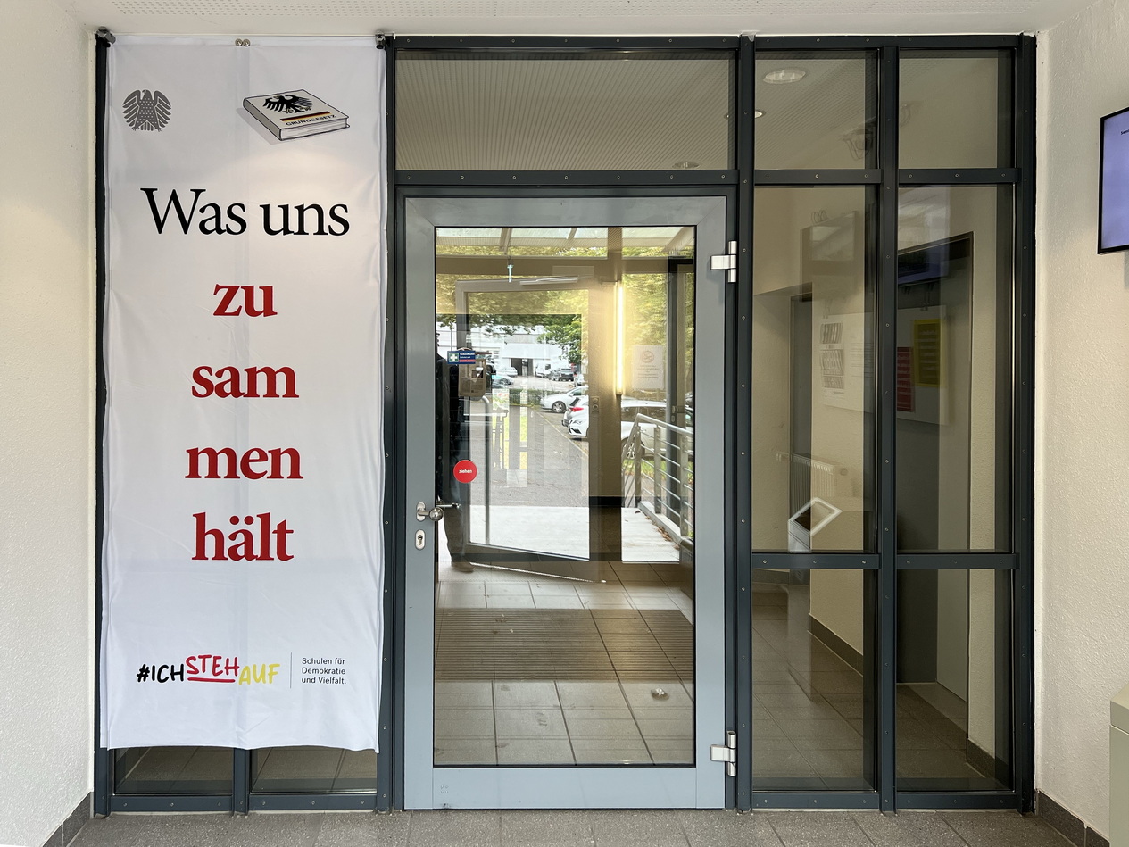 Die großformatigen Banner im Seminargebäude, die zentrale Artikel des Grundgesetzes visualisieren, sollen die Relevanz von Rechtsstaatlichkeit, Menschenwürde, Freiheit und Gleichheit in unserem täglichen Leben verdeutlichen.