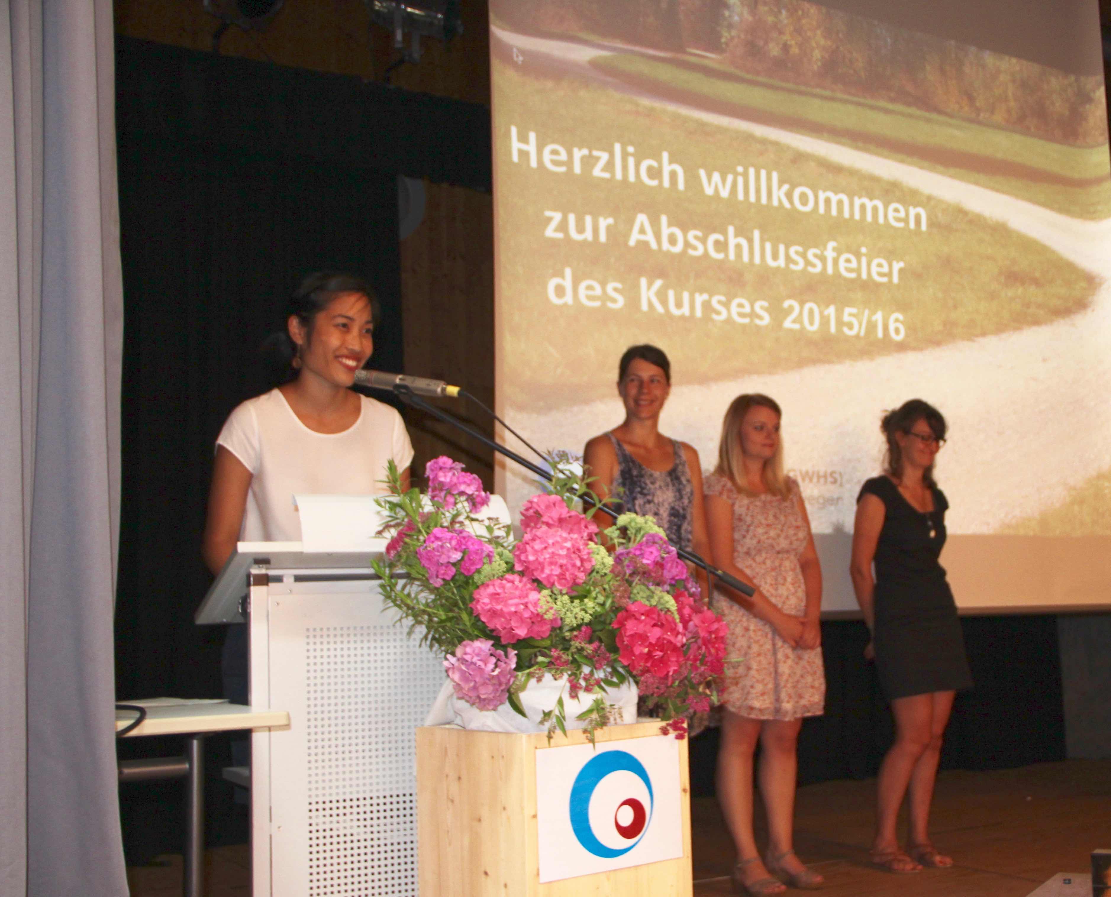 Die Rede von Doris Simon und der Segen zum Abschied, der von Frau Dr. Sabine Benz und Frau Diana Hughes stimmungsvoll gestaltet wurde, riefen das Thema der Kurseinführung im Februar 2015 wieder in Erinnerung. Sie animierten die Zuhörer, den gemeinsam zurückgelegten Weg noch einmal Revue passierten zu lassen und machten Mut, die vorausliegenden neuen Herausforderungen selbstbewusst anzugehen. Frau Ruof hob in ihrer Rede zur Verabschiedung hervor, dass die Lehramtsanwärterinnen und Lehramtsanwärter ihre zukünftigen Aufgaben sicher in professioneller Weise angehen werden. Die Gruppensprecherinnen und Sprecher dankten in ihren Grußworten der Seminarleitung, den Verwaltungsangestellten und den Lehrbeauftragten für ihre Unterstützung dabei.