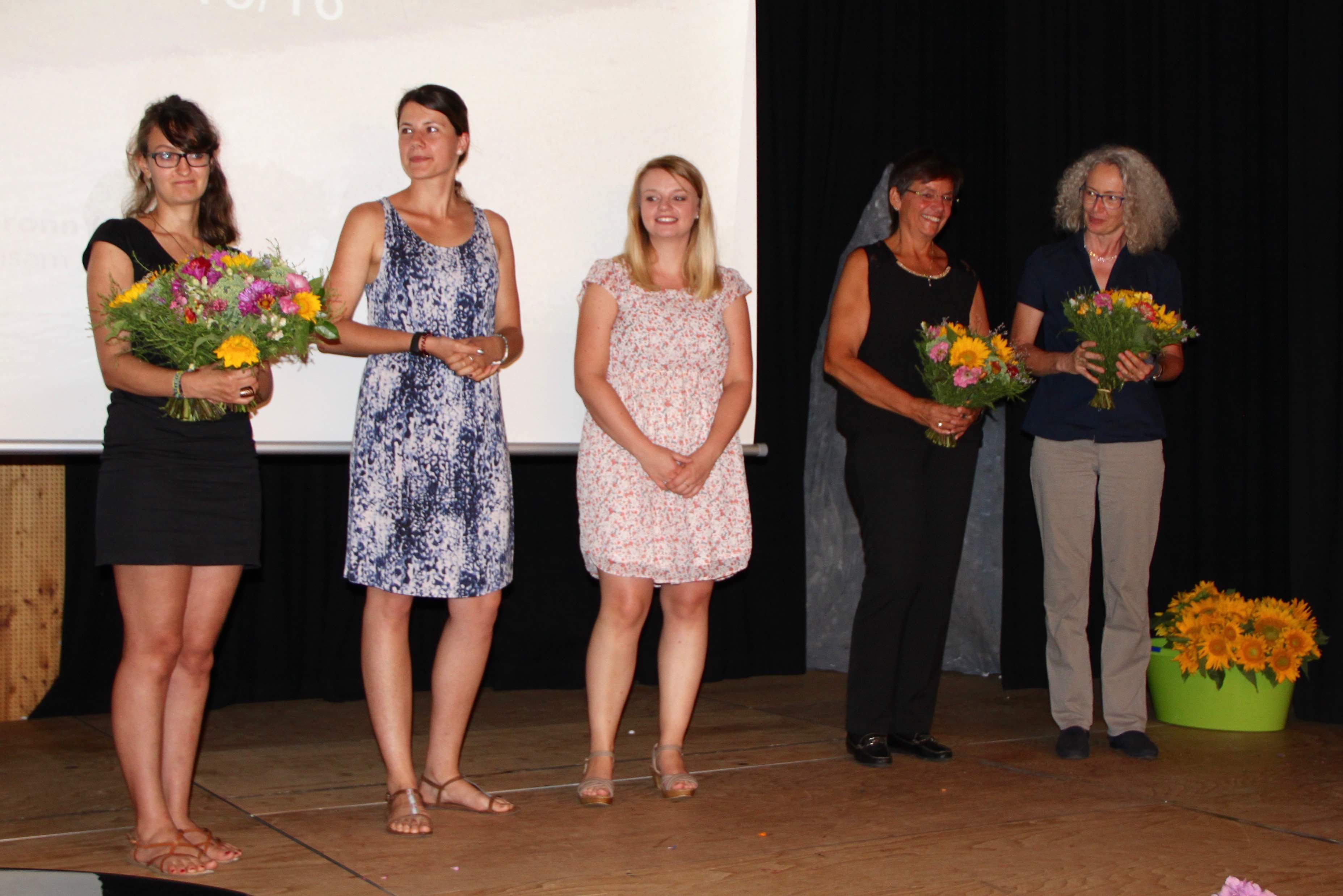 Kurssprecherinnen Juliane Cavallo, Julia Mertens und Annika Lorch mit Seminarleiterin Dipl.-Päd Susanne Ruof und stellvertretender Seminarleiterin Doris Simon auf der Bühne der Aula
