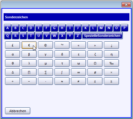 >Klicken Sie auf die Schaltfläche Spezielle Sonderzeichen, um Sonderzeichen zu finden, die sich keinem Buchstaben zuordnen lassen, z. B. das Zeichen € oder das Ungleichheitszeichen.