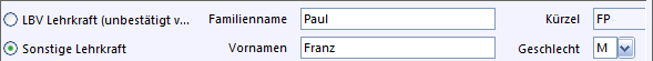 Durch Anklicken wird eine Auswahl zwischen verschiedenen Möglichkeiten getroffen, z. B. Auswahl zwischen LBV Lehrkraft und Sonstige Lehrkraft.