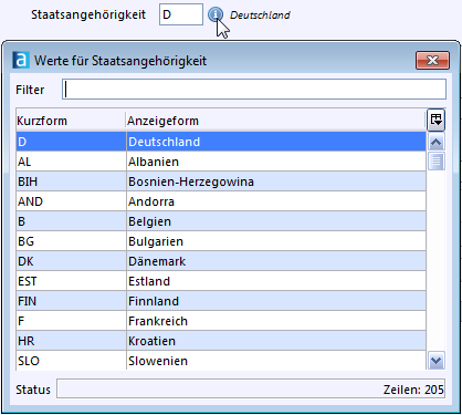 In der Statuszeile der Werteliste ist die Anzahl der auswählbaren Zeilen aufgeführt. Besonders bei einer hohen Zahl lohnt es sich, die Trefferquote durch Eingabe in den oben vorhandenen Filter zu verkürzen. Zum Beispiel werden im Wertehilfefenster Werte für Geburtsland insgesamt 205 Einträge angeboten. Deren Zahl reduziert sich durch die Eingabe von nl für Niederlande.