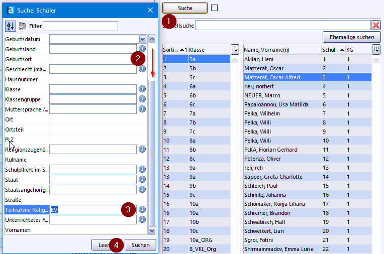 Öffnen Sie über die Schaltfläche Suchen die Suchmaske, scrollen Sie nach unten und wählen Sie über das Symbol aus der Werteliste des Feldes Teilnahme Religions-/Ethikunterricht das Fach Evangelischer Religionsunterricht aus. Klicken Sie danach die Schaltfläche Suchen.