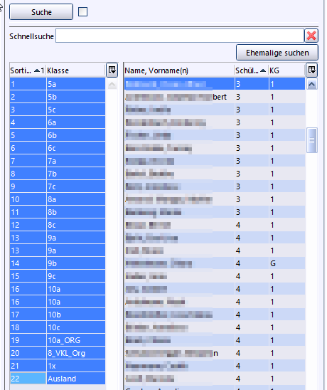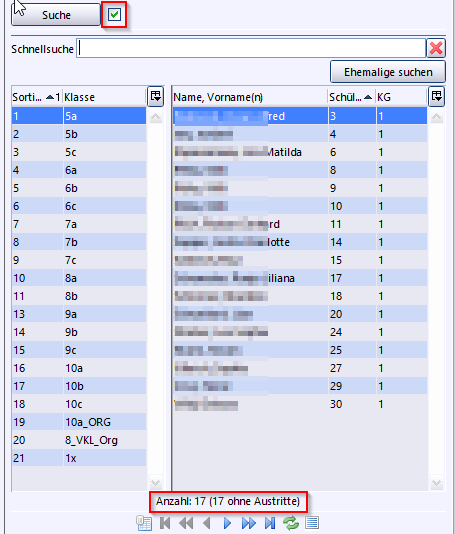 Das Suchergebnis zeigt im Beispiel nun 17 Schüler an. Durch den Haken in der Checkbox bei Suche wissen Sie, dass derzeit eine Suchauswahl angezeigt wird. Wird der Haken entfernt, ist die Suche nicht mehr aktiv und es werden wieder alle Schüler der Klasse angezeigt.