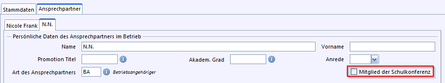 Mitglied der Schulkonferenz Im Modul Betriebe auf dem Reiter Ansprechpartner können Sie hinterlegen, ob bzw. welcher Ansprechpartner eines Betriebes ein Mitglied der Schulkonferenz ist.